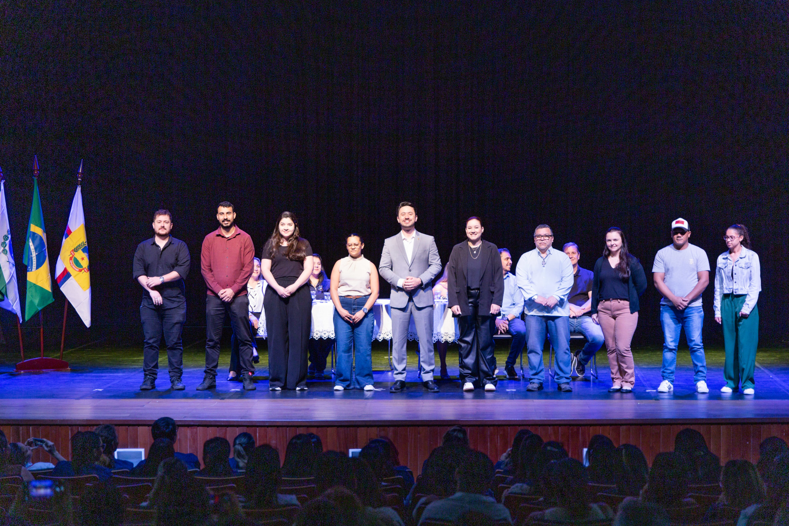 A Prefeitura de Apucarana realizou, na manhã desta sexta-feira (7/11), no Cine Teatro Fênix, uma cerimônia que marcou dois avanços importantes na área educacional: a valorização dos servidores e a ampliação da estrutura da rede municipal. O evento reuniu profissionais da Educação para a posse de 40 novos servidores — sendo 30 professores e 10 assistentes de atendimento — e também para a entrega de certificados a 156 educadores que concluíram o estágio probatório, consolidando a efetivação na carreira pública.
