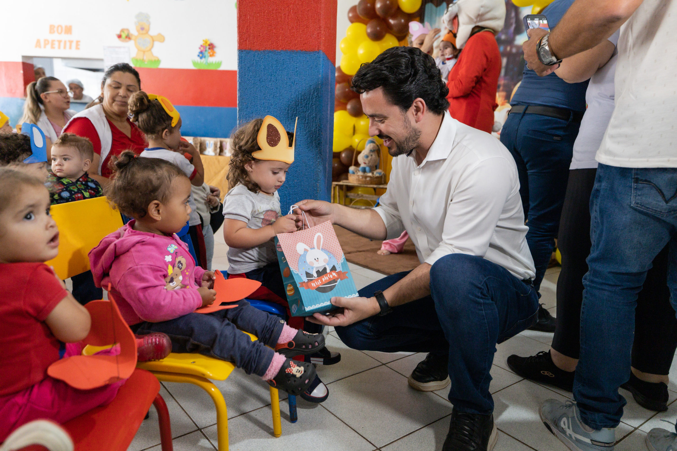 Nesta terça-feira (15/4), o prefeito Rodolfo Mota, a primeira-dama Karine Mota e a secretária de educação, professora Ana Paula do Carmo Donato, acompanharam a distribuição dos chocolates na sede da APAE e em alguns dos Centros Municipais de Educação Infantil (CMEIs) e Escolas Municipais.