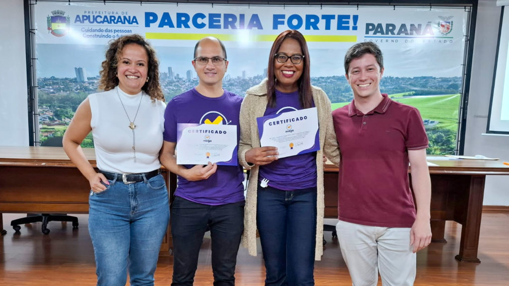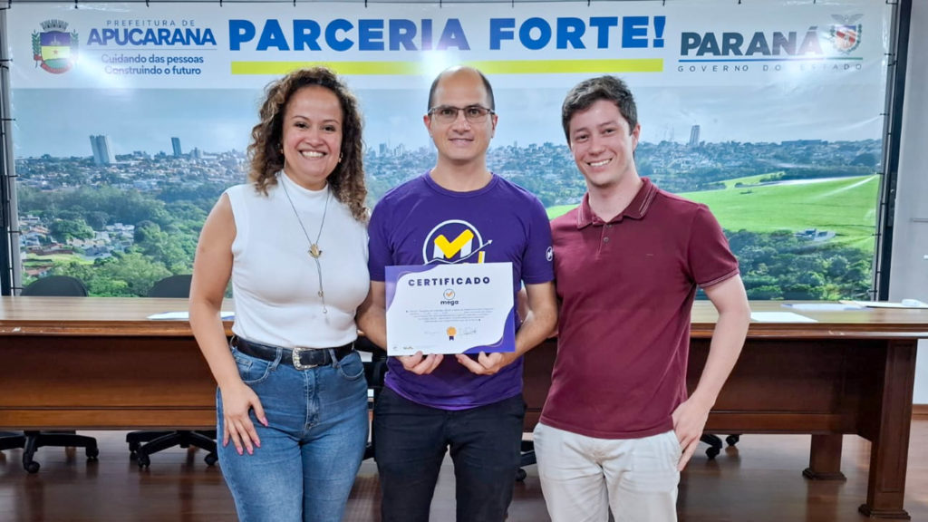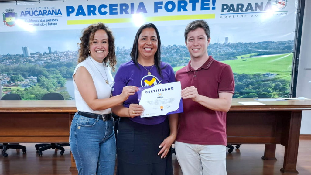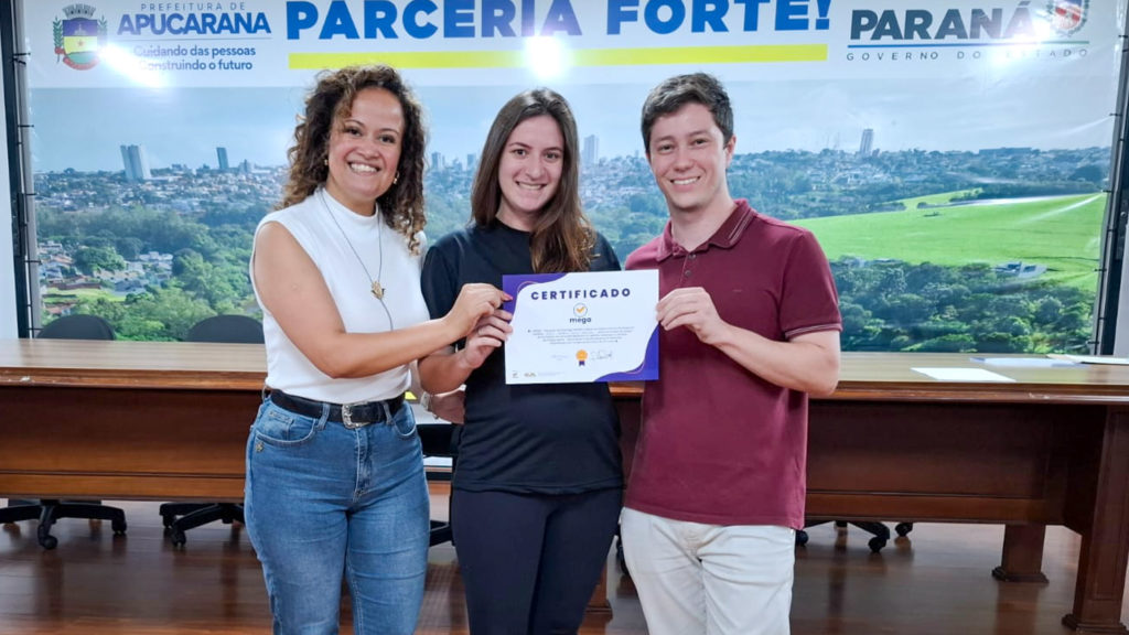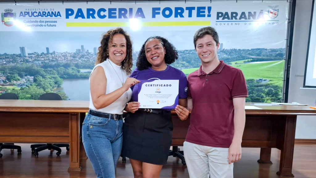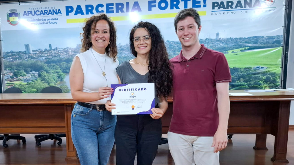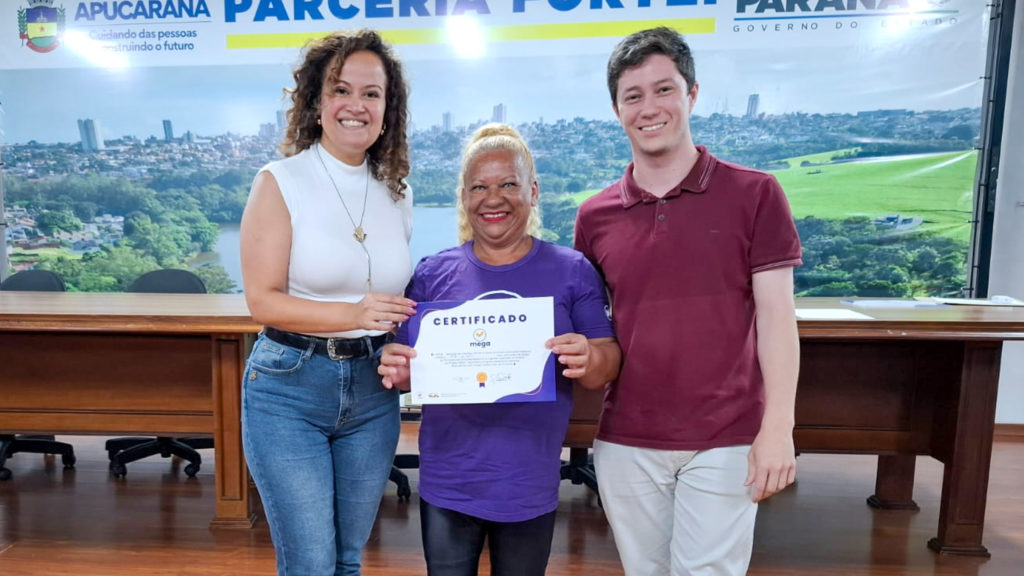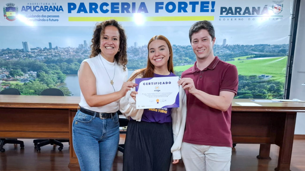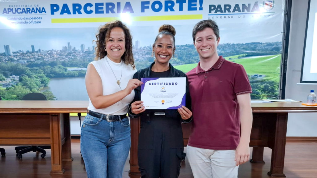 Três mulheres participantes de uma capacitação gratuita voltada a micro e pequenas empreendedoras que já têm ou pretendem iniciar um negócio próprio receberam, nesta quarta-feira (05/11), um capital-semente de R$1,5 mil cada, em evento realizado no Salão Nobre da Prefeitura de Apucarana. A entrega fez parte do projeto MEGA – Movimento Empreendedorismo Gerando Alternativas, promovido pela organização GERAR – Geração de Emprego, Renda e Apoio ao Desenvolvimento Regional, em parceria com a Secretaria Municipal da Mulher e Assuntos da Família (Semaf).