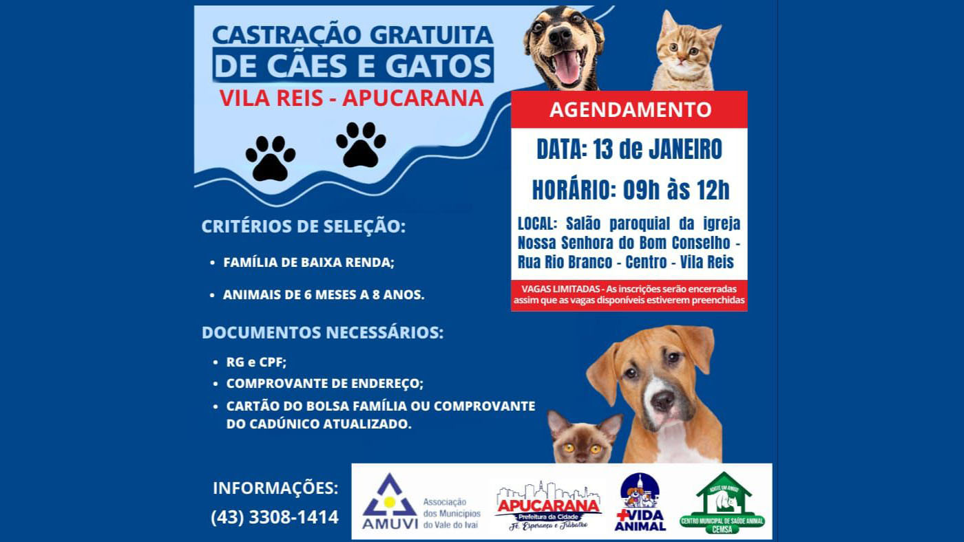Correa informa ainda que o mutirão é voltado para famílias de baixa renda. “As pessoas devem levar para o agendamento RG, CPF, comprovante de endereço e cartão do bolsa família ou comprovante do cadúnico atualizado”, cita, acrescentando que o mutirão fará a castração de cães e gatos com idades entre 6 meses e 8 anos.