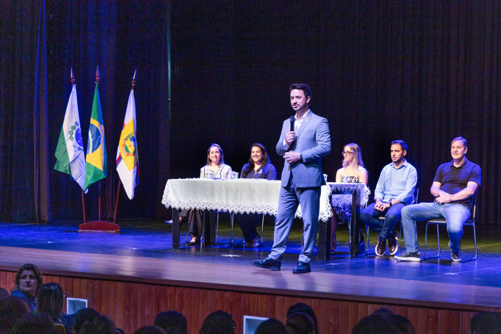 A Prefeitura de Apucarana realizou, na manhã desta sexta-feira (7/11), no Cine Teatro Fênix, uma cerimônia que marcou dois avanços importantes na área educacional: a valorização dos servidores e a ampliação da estrutura da rede municipal. O evento reuniu profissionais da Educação para a posse de 40 novos servidores — sendo 30 professores e 10 assistentes de atendimento — e também para a entrega de certificados a 156 educadores que concluíram o estágio probatório, consolidando a efetivação na carreira pública.