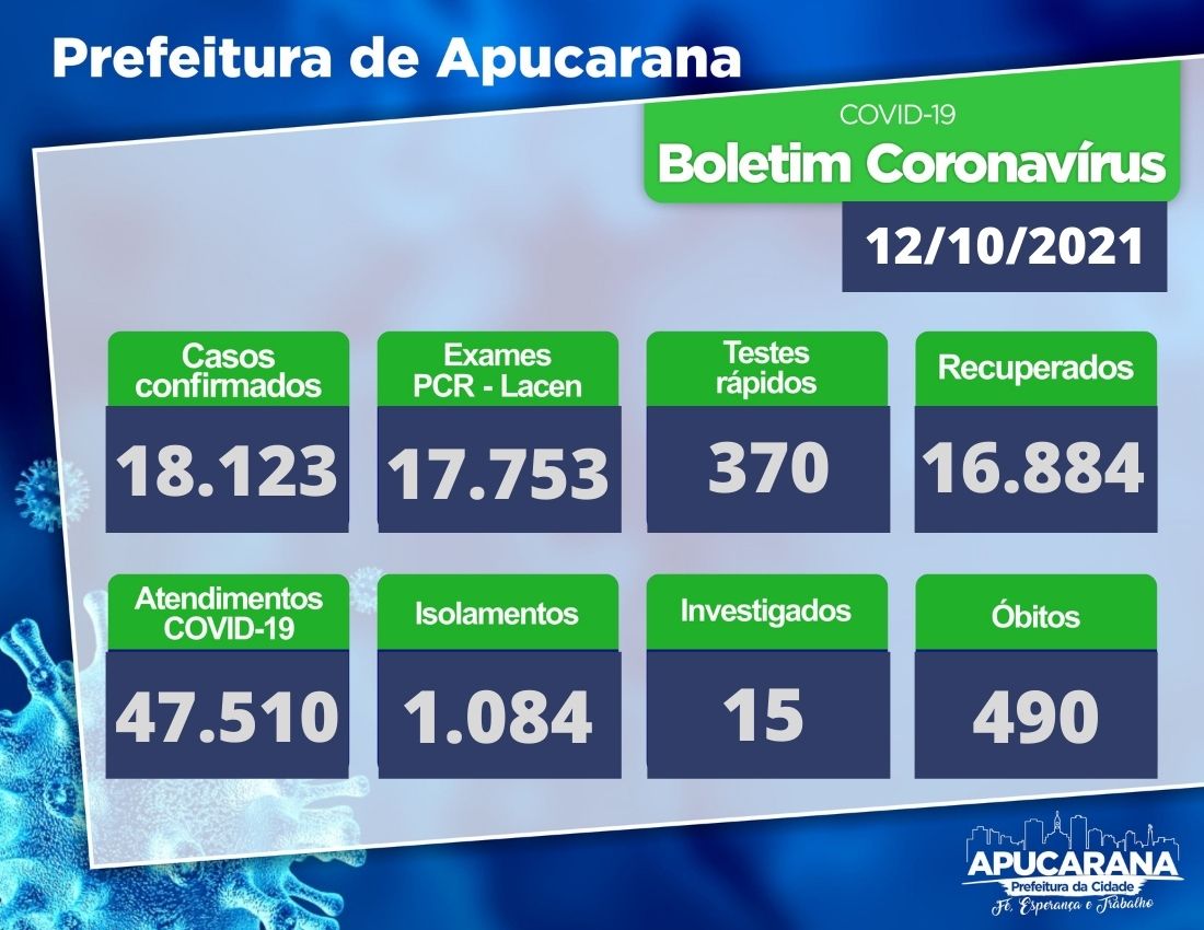 A Autarquia Municipal de Saúde (AMS) confirmou nesta terça-feira (12), feriado nacional de Nossa Senhora Aparecida, mais dez casos de Covid-19 em Apucarana. O município segue com 490 mortes provocadas pela doença e agora soma 18.123 diagnósticos positivos do novo coronavírus.