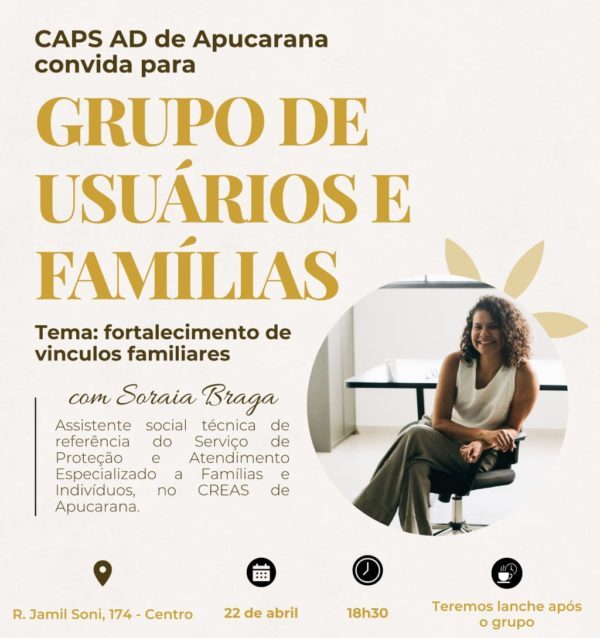 A Prefeitura de Apucarana convida a população para participar de mais um encontro do grupo noturno de usuários, famílias e rede de apoio do Centro de Atenção Psicossocial Álcool e Drogas (CAPS AD). A atividade será realizada no dia 22 de abril, das 18h30 às 20 horas, na Rua Jamil Soni, nº 174, no Bairro 28 de Janeiro.