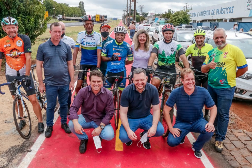 O prefeito Junior da Femac e o vice Paulo Vital, acompanhados de outras autoridades, entregaram de forma oficial para a população a Ciclovia Irmo Celso Vidor. A pista, com 2.700 metros de extensão, segue todas as normas da legislação de trânsito, com a pintura vermelha e toda a sinalização necessária, além de um ponto de apoio aos ciclistas, junto ao bonezão. O investimento, com recursos próprios do município, foi de R$ 450 mil, executado pela Construtora Vitorino, de Apucarana.