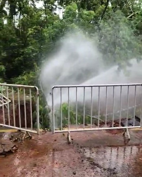 A Prefeitura de Apucarana mobilizou, na manhã desta segunda-feira (17/11), uma nova força-tarefa emergencial após a chuva intensa das últimas horas provocar o desmoronamento de terra aumentando ainda mais a cratera que se abriu na Rua Rio dos Patos, no Núcleo João Paulo I. A movimentação do solo, somada à queda de uma árvore, acabou rompendo a adutora da Sanepar