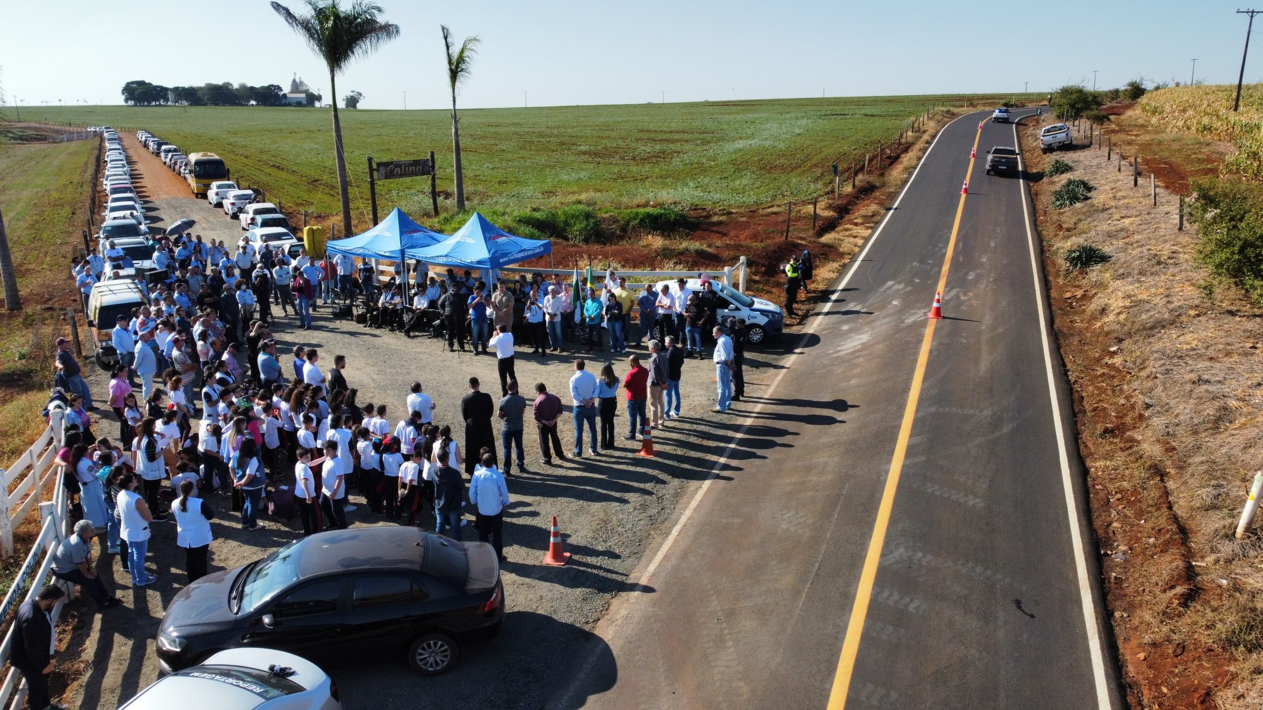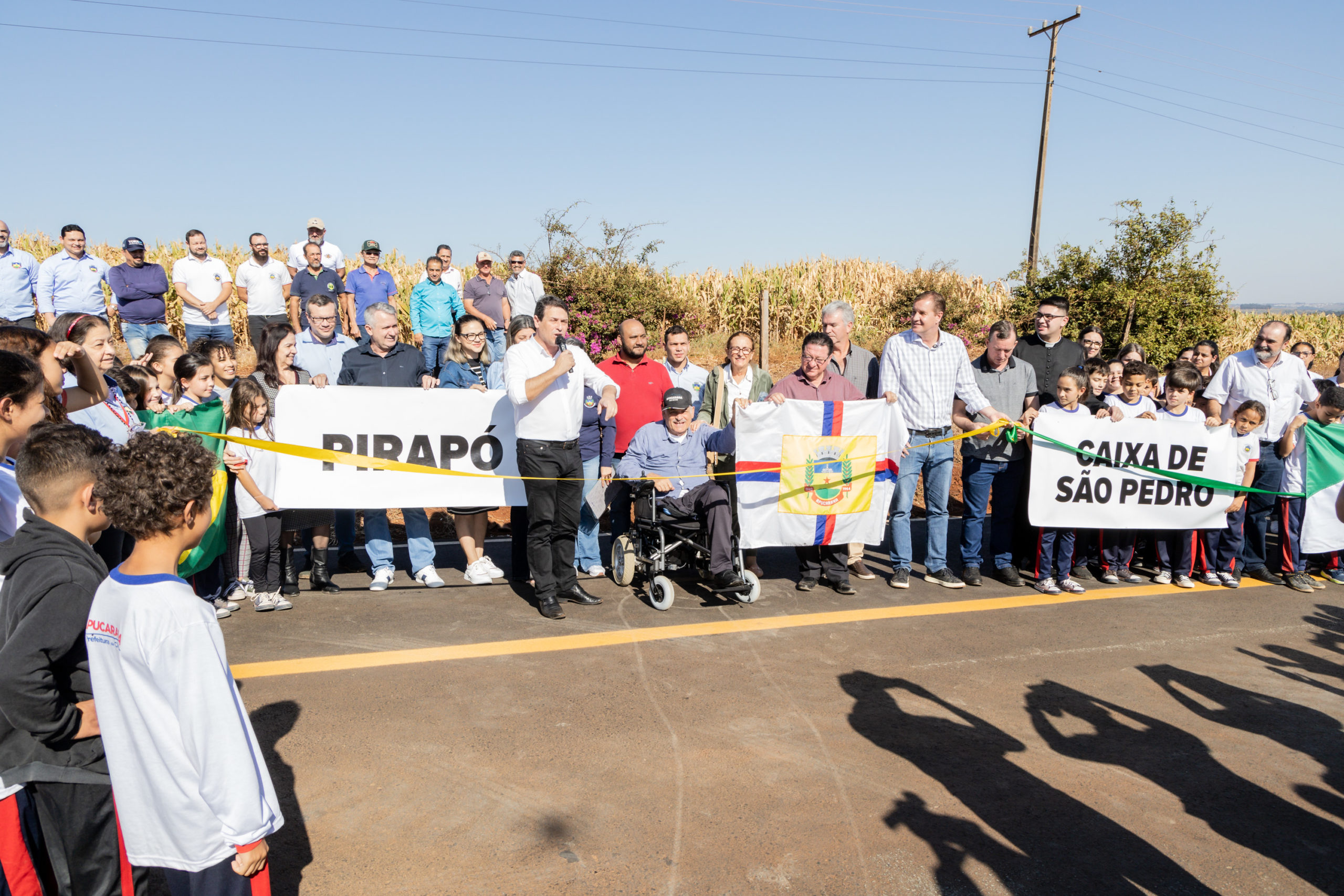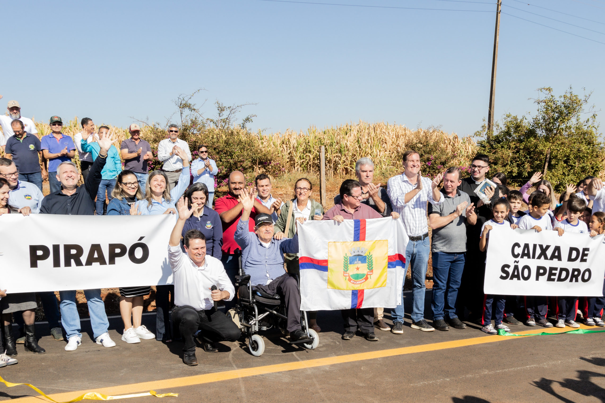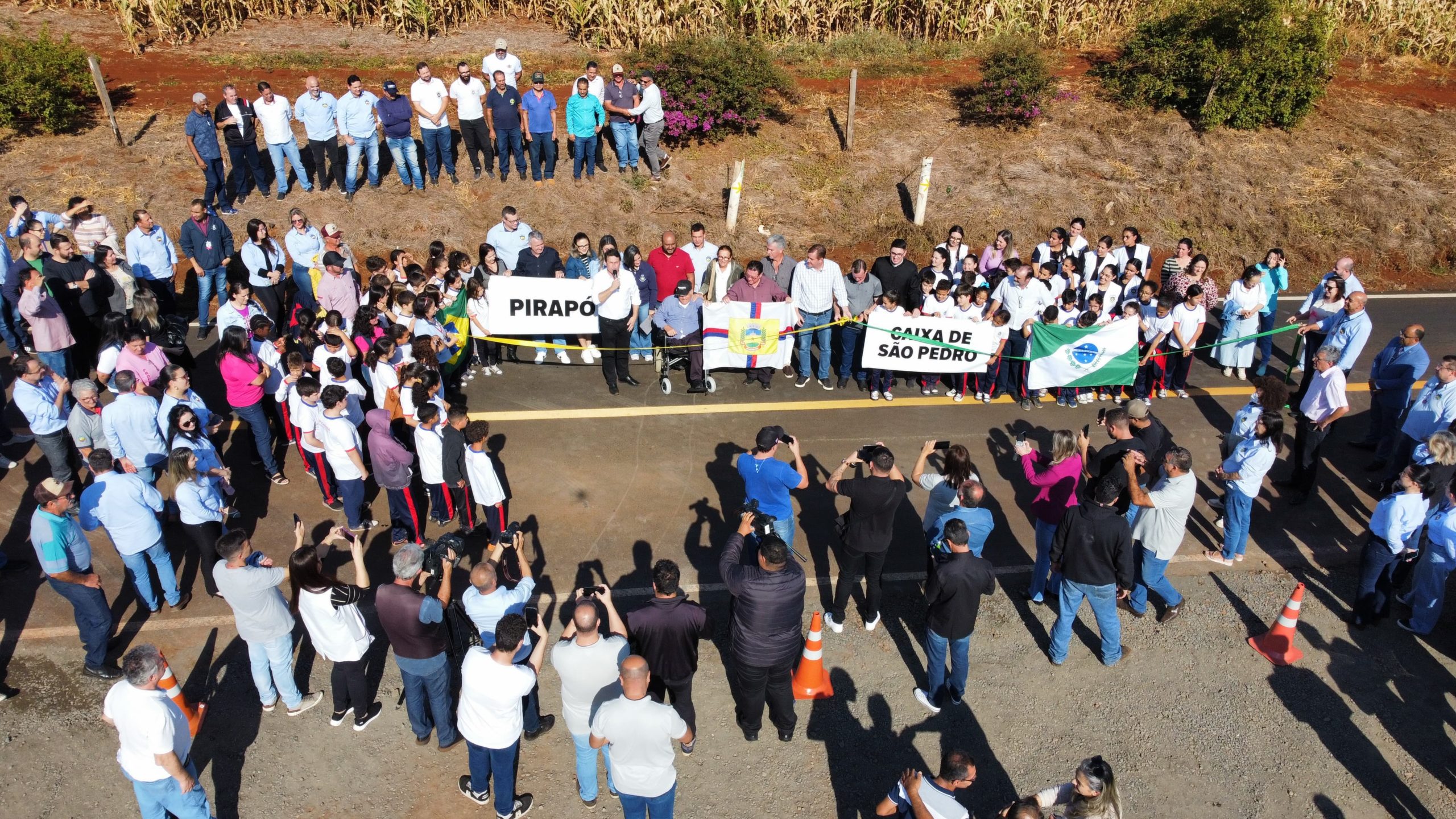 De um lado, uma fileira de moradores e estudantes segurava a faixa do Distrito de Pirapó e a eles se juntou um outro grupo, portando a faixa que representava o Distrito de Caixa de São Pedro. O ponto de encontro foi o acesso à Fazenda Colina, praticamente na divisa entre os distritos, e todos tinham um objetivo em comum: celebrar o progresso e a pavimentação de 11,5 quilômetros que liga as duas comunidades.
