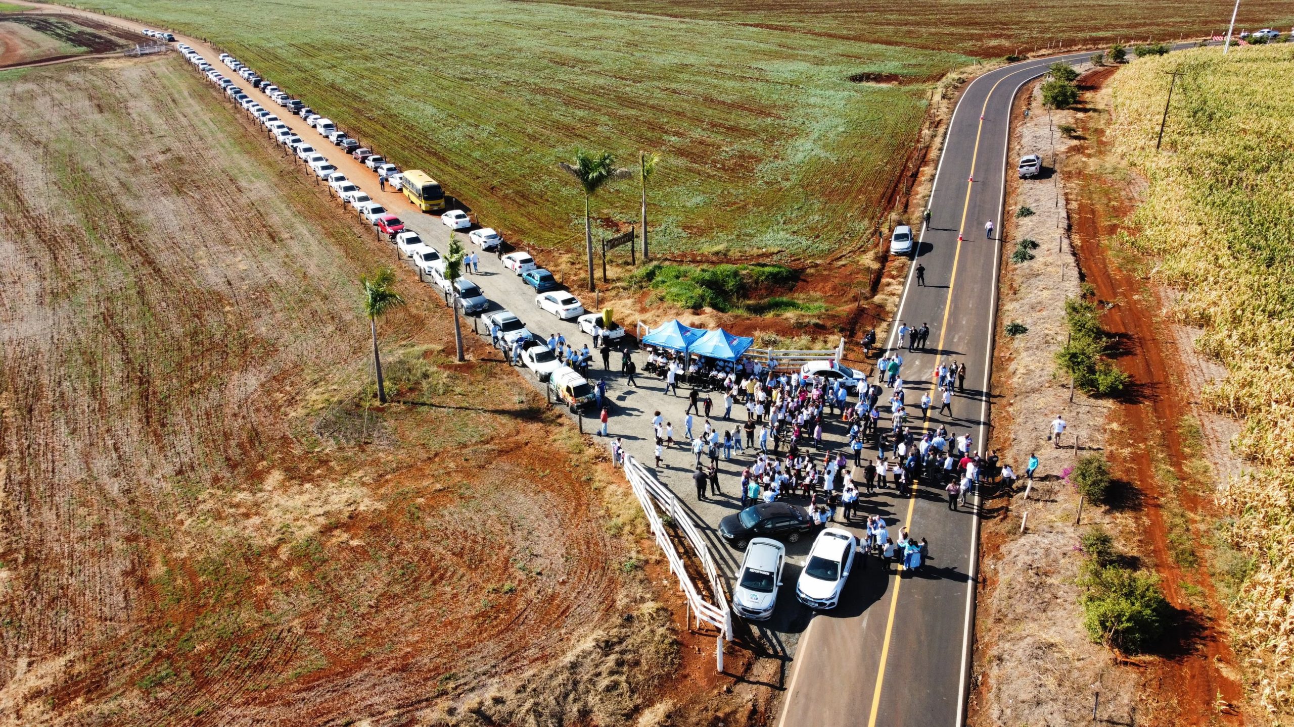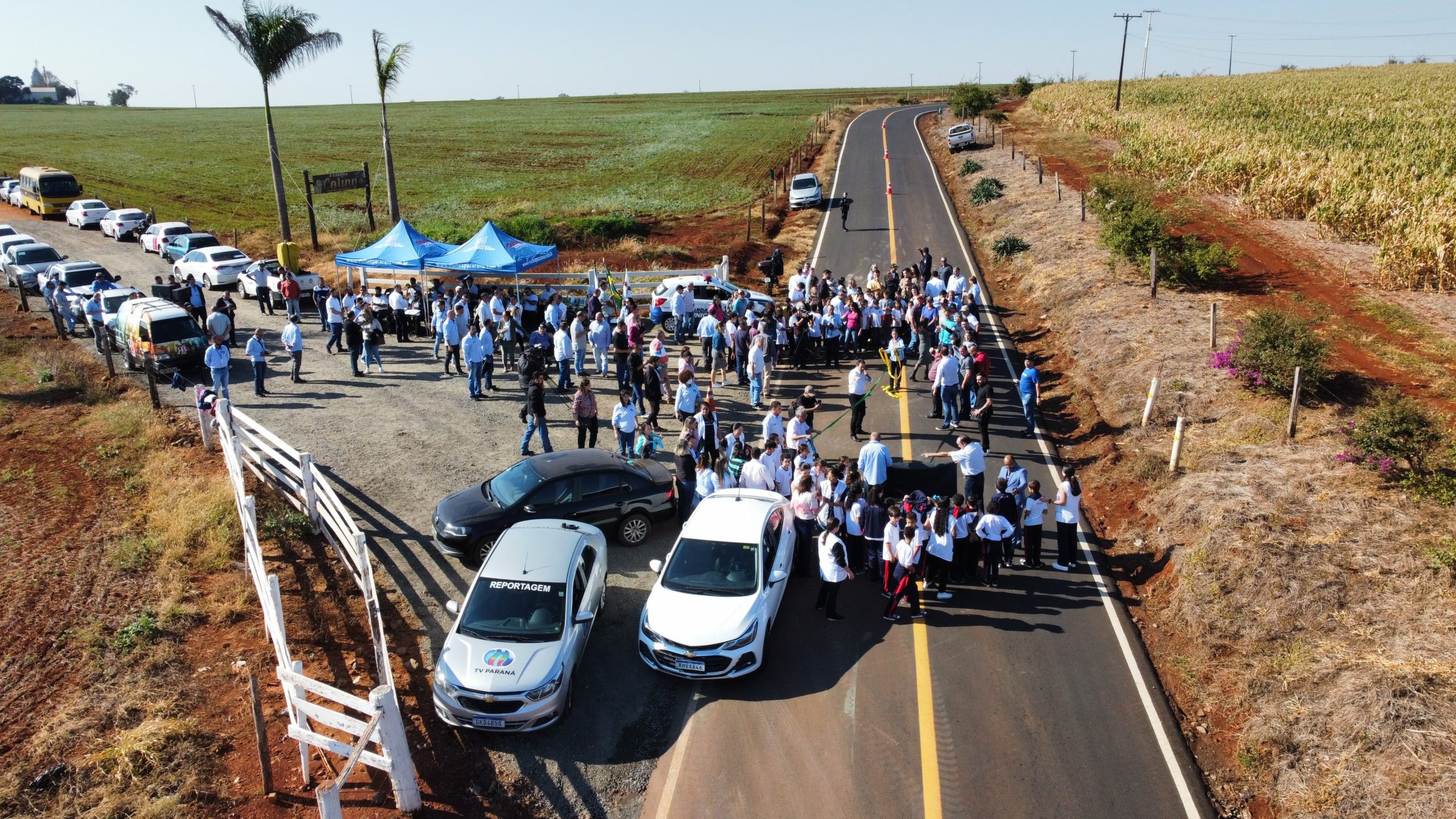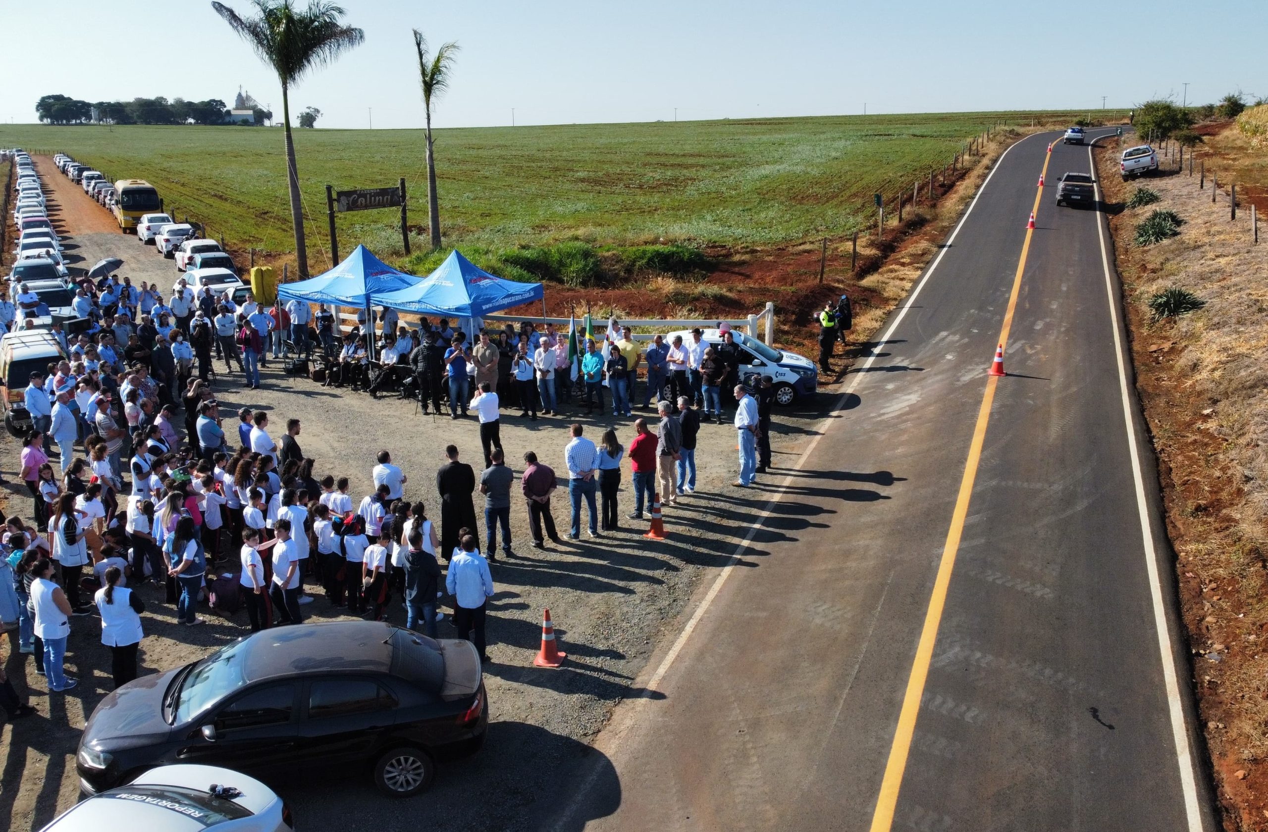De um lado, uma fileira de moradores e estudantes segurava a faixa do Distrito de Pirapó e a eles se juntou um outro grupo, portando a faixa que representava o Distrito de Caixa de São Pedro. O ponto de encontro foi o acesso à Fazenda Colina, praticamente na divisa entre os distritos, e todos tinham um objetivo em comum: celebrar o progresso e a pavimentação de 11,5 quilômetros que liga as duas comunidades.