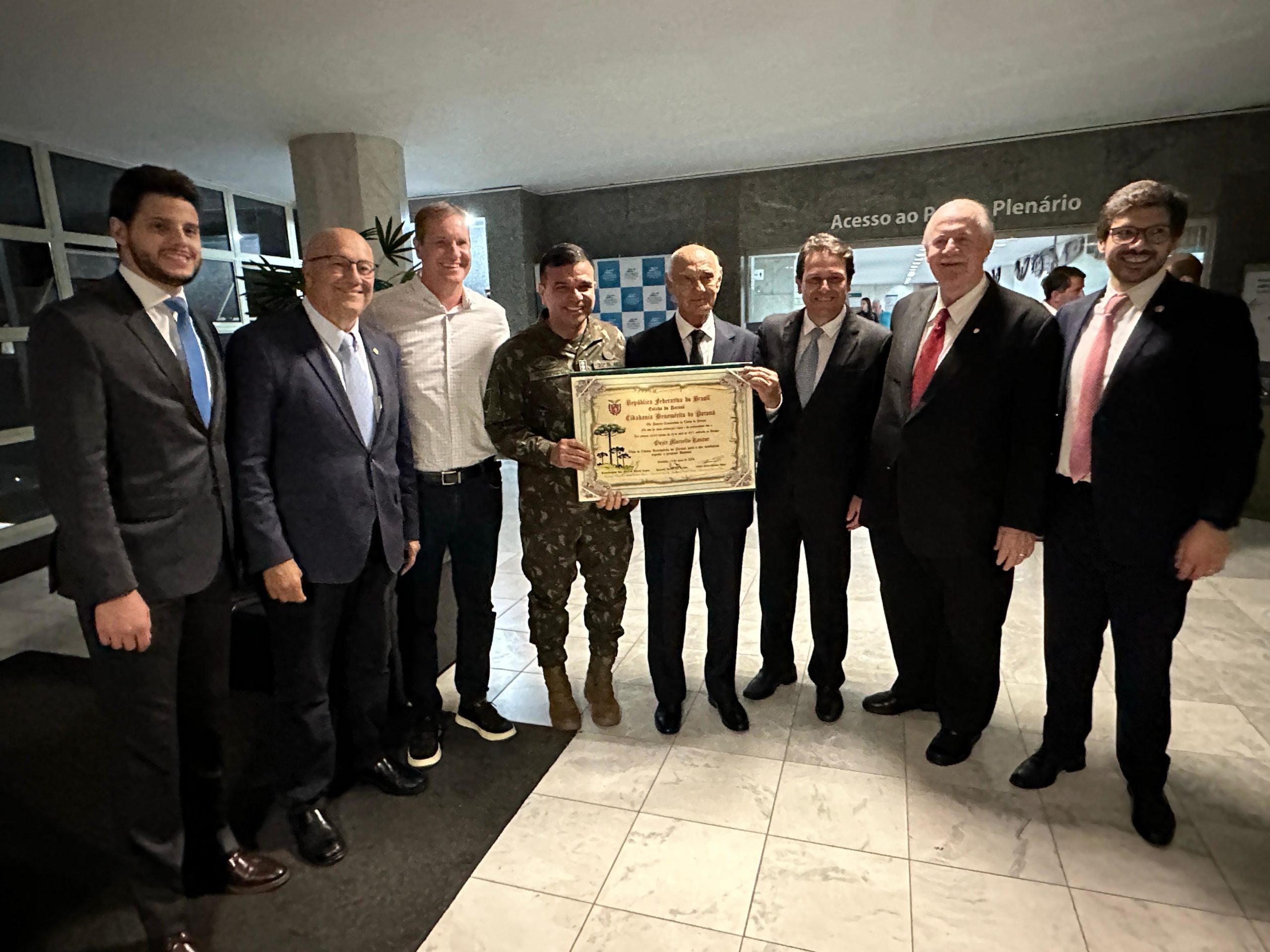 O vereador Rodrigo Lievore lembra a trajetória de Oezir Marcello Kantor, que completará 90 anos em julho. “Nós nos aproximamos bastante do seu Kantor, em função das pautas do Exército e estando sempre juntos em ações e eventos do 30º BIMec. O seu Kantor tem uma história belíssima e um grande legado”, frisa Lievore, acrescentando que o homenageado também é cidadão honorário de Apucarana e, dentre as diversas atividades de apoio ao Exército, cede a sua propriedade para que o 30º BIMec realize treinamentos.