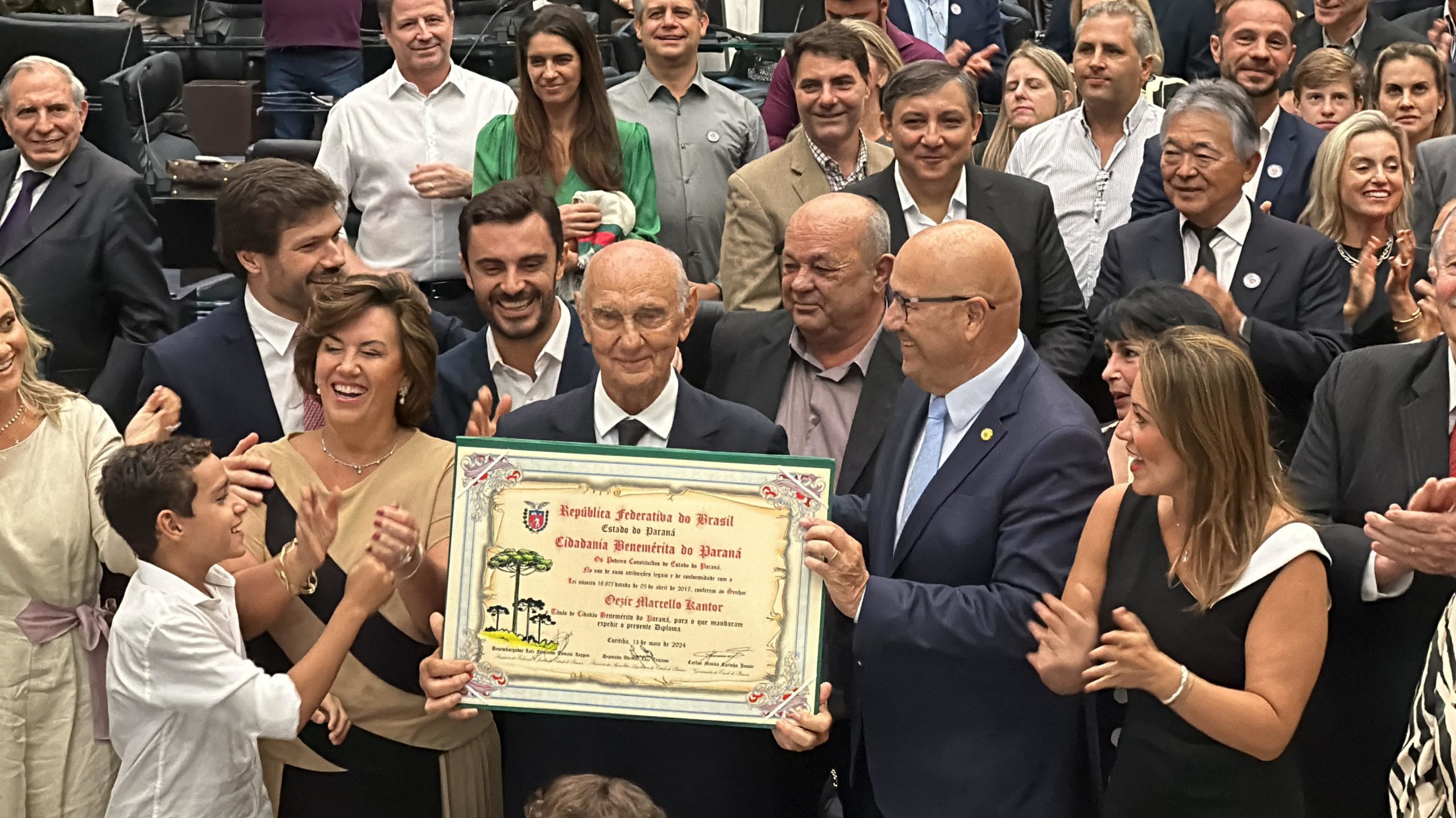 O agropecuarista Oezir Marcello Kantor recebeu o título de Cidadão Benemérito do Paraná, concedido pela Assembleia Legislativa do Paraná. A honraria foi proposta pelos deputados estaduais Alexandre Curi, primeiro-secretário da Assembleia, e Luiz Claudio Romanelli. O título é um reconhecimento pelo importante papel desempenhado pelo homenageado no desenvolvimento social e na promoção da agricultura e pecuária do Paraná.