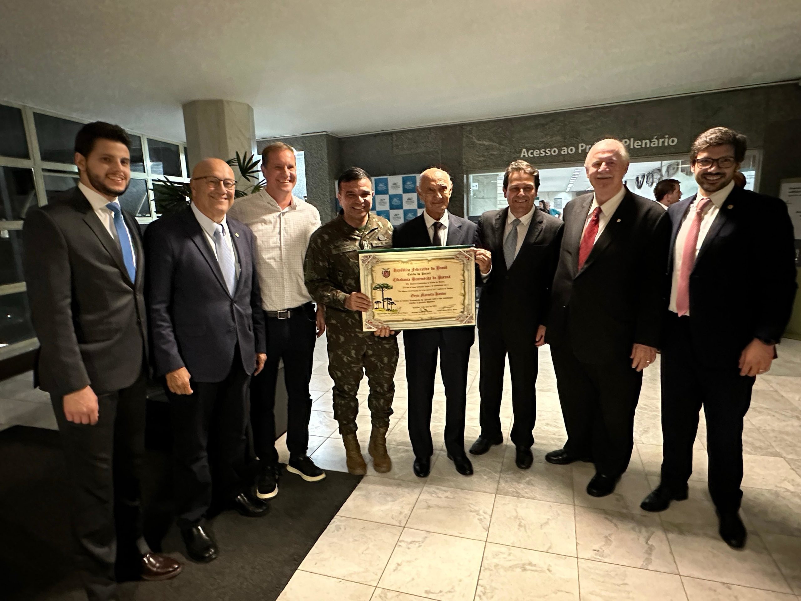 O vereador Rodrigo Lievore lembra a trajetória de Oezir Marcello Kantor, que completará 90 anos em julho. “Nós nos aproximamos bastante do seu Kantor, em função das pautas do Exército e estando sempre juntos em ações e eventos do 30º BIMec. O seu Kantor tem uma história belíssima e um grande legado”, frisa Lievore, acrescentando que o homenageado também é cidadão honorário de Apucarana e, dentre as diversas atividades de apoio ao Exército, cede a sua propriedade para que o 30º BIMec realize treinamentos.