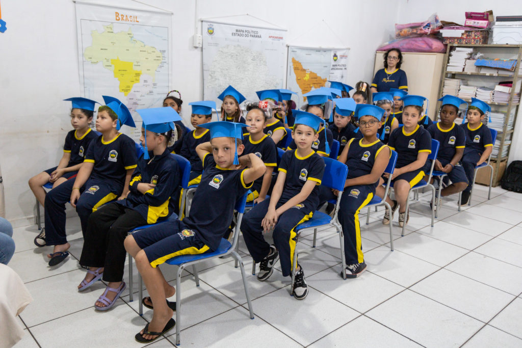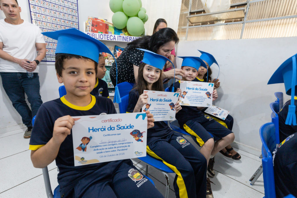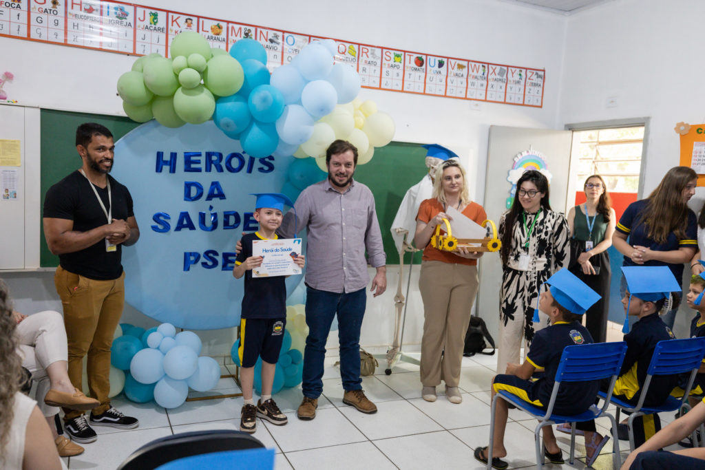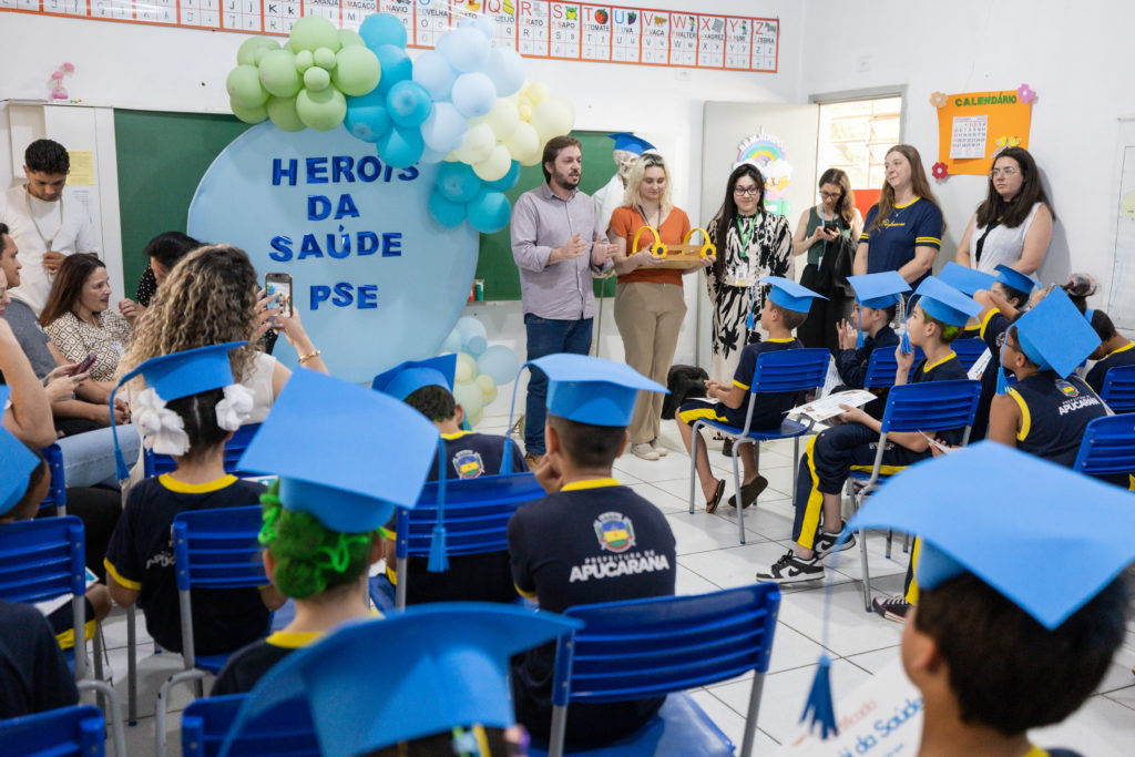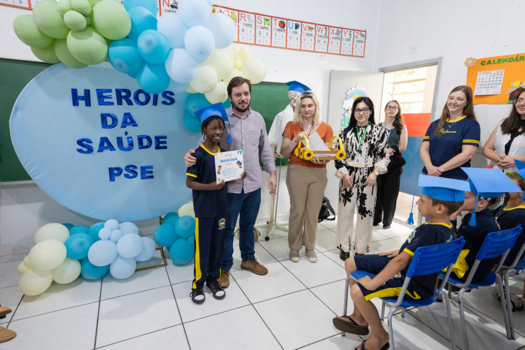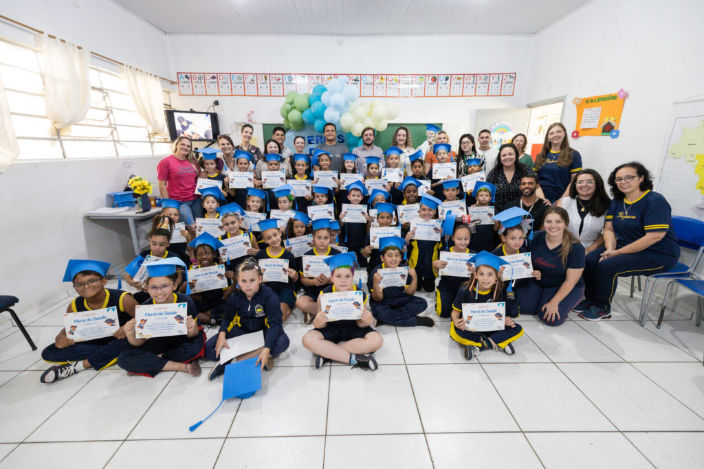 Na manhã desta segunda-feira (6/10), cerca de 50 estudantes dos 3º anos A e B da Escola Municipal Vereador José Ramos de Oliveira, no distrito de Pirapó, receberam o certificado de “Heróis da Saúde”, após concluírem uma formação sobre hábitos saudáveis. A ação integra o Programa Saúde na Escola (PSE), desenvolvido em parceria pela Autarquia Municipal de Educação (AME) e pela Autarquia Municipal de Saúde de Apucarana.