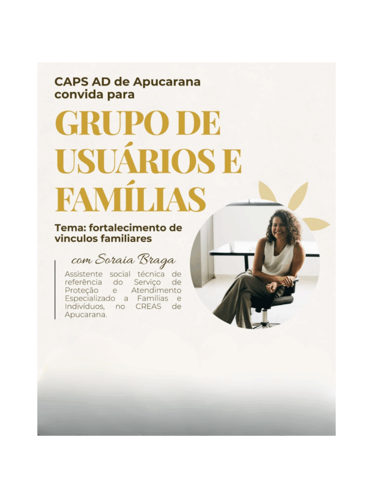 A Prefeitura de Apucarana convida a população para participar de mais um encontro do grupo noturno de usuários, famílias e rede de apoio do Centro de Atenção Psicossocial Álcool e Drogas (CAPS AD). A atividade será realizada no dia 22 de abril, das 18h30 às 20 horas, na Rua Jamil Soni, nº 174, no Bairro 28 de Janeiro. O tema